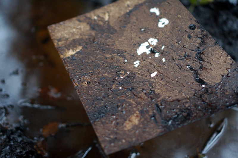 Dans la forêt entre Gunstett et Surbourg, guidés par Pascale, médiatrice du Musée du Pétrole, nous sommes un groupe à découvrir une résurgence. C’est l’automne, les feuilles des chênes sont de plus en plus imprégnées de pétrole brut, noir et huileux, vers le centre de la résurgence. L’odeur est forte. Tout autour, les arbres sont maculés jusqu’à un mètre de hauteur. Une ligne d’horizon se forme, celle des corps des sangliers qui s’imprègnent puis se frottent.